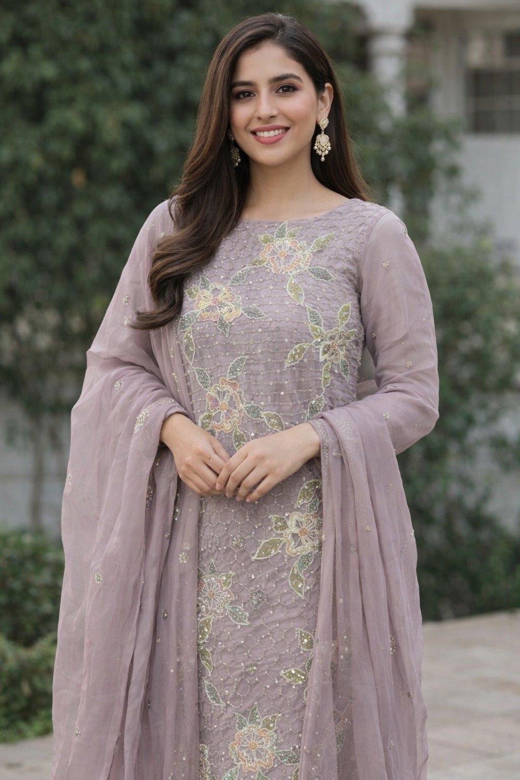 Crepe silk suit material with sequins work at daman and chiffon dupatta with stone works allover.